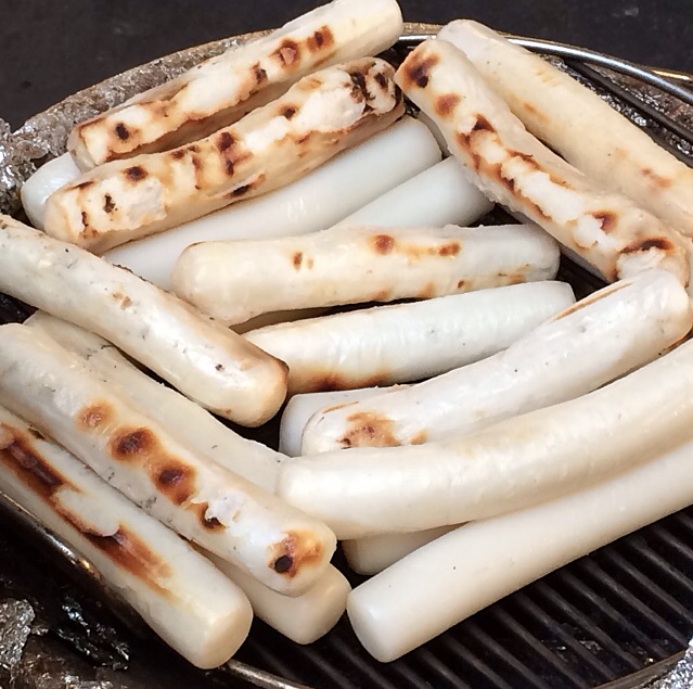 Garae-tteok (가래떡) is a long, cylindrical tteok (rice cake) made with non-glutinous rice. Grilled garae-tteok is sometimes sold as street food.[3] Thinly (and usually diagonally) sliced garae-tteok is used for making tteokguk (rice cake soup), a traditional dish eaten during the celebration of the Korean New Year.