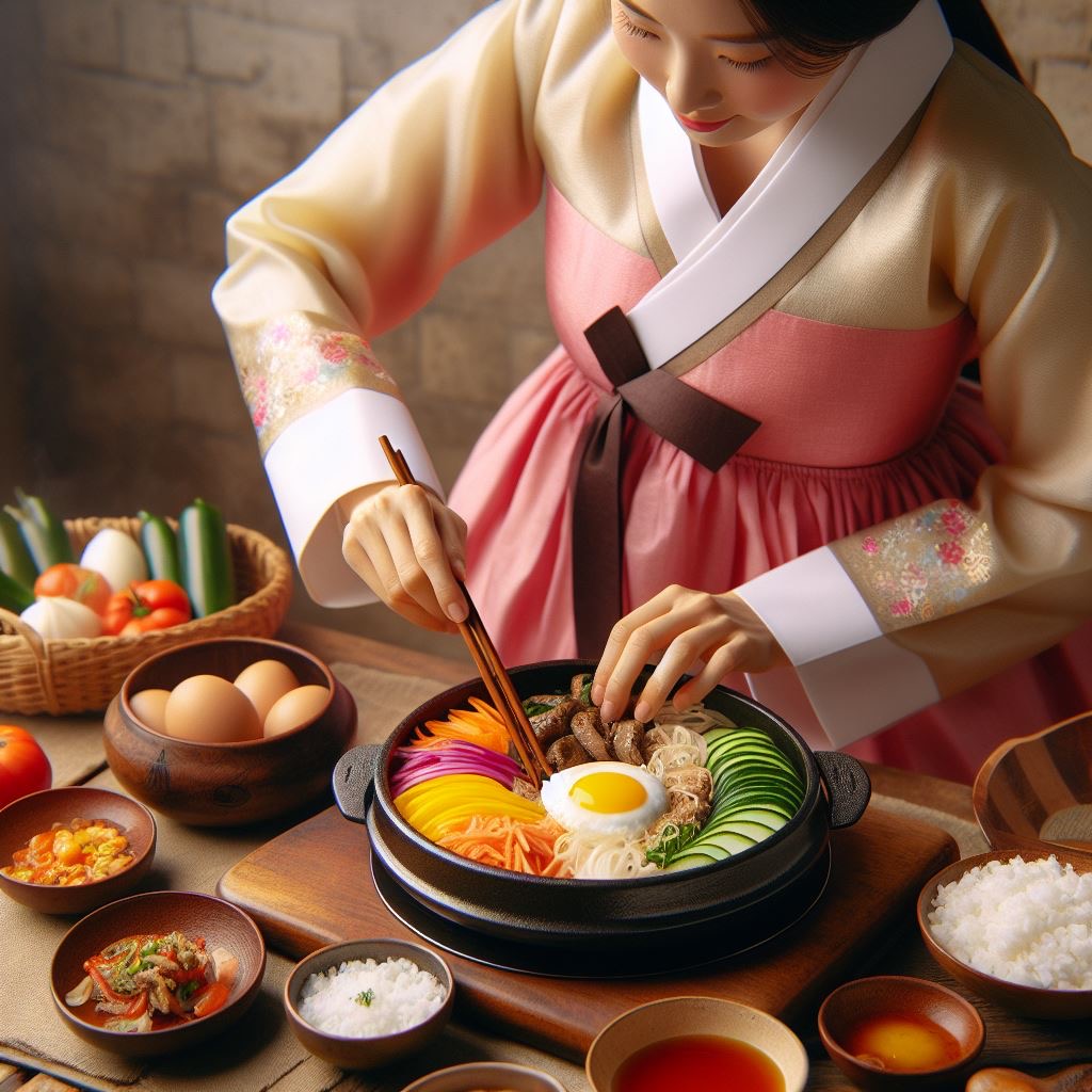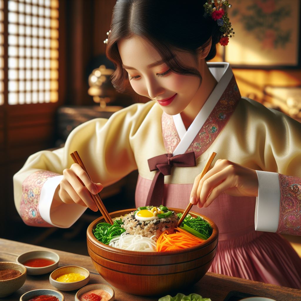 한국 전통 음식 비빔밥, 맛있는 요리 냄새, 군침이 도는 음식 사진, 3D, 고화질, 비빔밥을 만드는 한복을 입은 행복한 한국 여성, 미묘한 빛, 낮은 각도의 전문 스틸 사진, 초현실주의. —스타일 프리미티브 —v 6.0 —ar 3:4; 클로즈업 촬영, 중망원 렌즈(85mm), 고해상도(8K), 따뜻한 주변 조명.