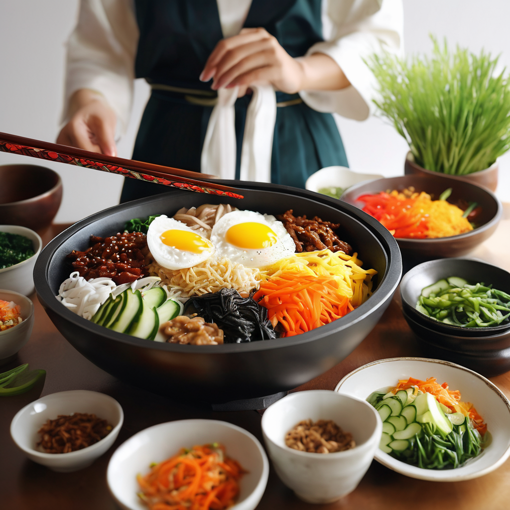 Korean traditional food bibimbap, delicious cooking smell, mouth-watering food photography, 3D, high definition, happy Korean woman in hanbok making bibimbap, subtle light, low angle professional still photo, surrealism. —style primitives —v 6.0 —ar 3:4; Close-up shot, medium telephoto lens (85mm), high resolution (8K), warm ambient lighting.